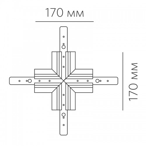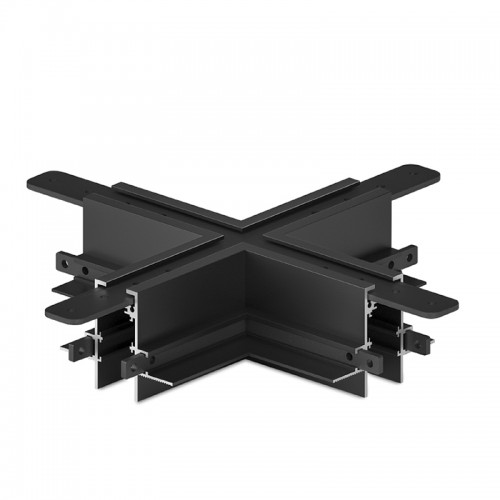 Бесшовное пересечение. Соединитель обеспечивает механическую жёсткость и электрическую целостность всех четырёх направлений. Медные контакты гарантируют стабильную передачу 48V без потерь. Магнитная лента внутри узла не прерывается — светильники проезжают перекрёсток плавно, без заеданий. После монтажа и шпаклёвки узел становится частью потолочной плоскости: видимой остаётся только чёрная полоса шириной 27 мм, пересекающаяся с другой такой же полосой под углом 90°.