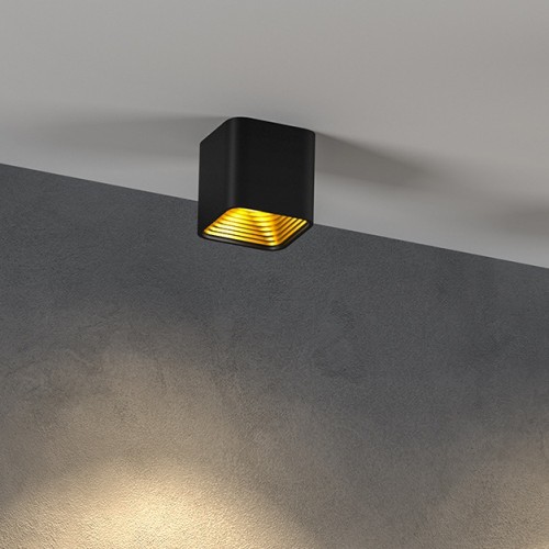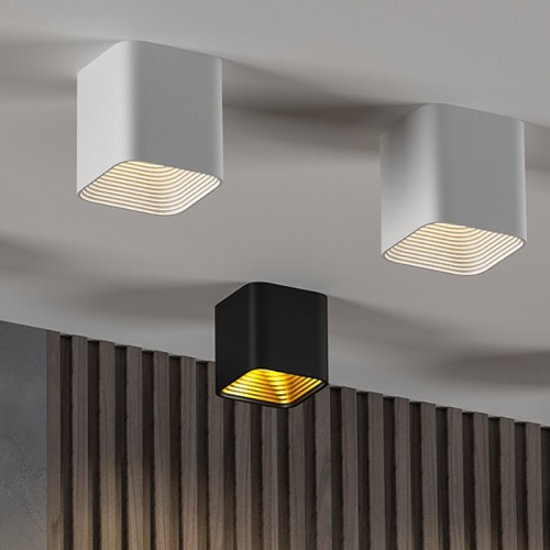 UGO S 10.30 WS — накладной светильник кубической формы (80×80×80 мм) со скруглёнными боковыми гранями, выполненный в белом алюминиевом корпусе с серым внутренним отражателем. Это тот случай, когда цвет работает на двух уровнях: белый куб остаётся нейтральным фоном на потолке, а серый отражатель, видимый под определённым углом, добавляет глубины и визуального веса. Рифлёный рассеиватель в форме усечённой пирамиды заглублён в корпус — такое решение не только защищает глаза от прямых лучей, но и создаёт сложную игру света и тени на самой поверхности светильника.