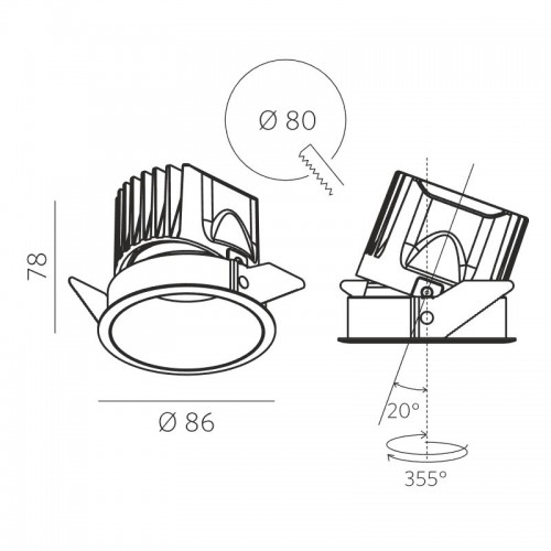 Излучает мягкий, теплый и рассеянный свет 53°. Опционально оснащается оптическими линзами для создания угла света 20°.