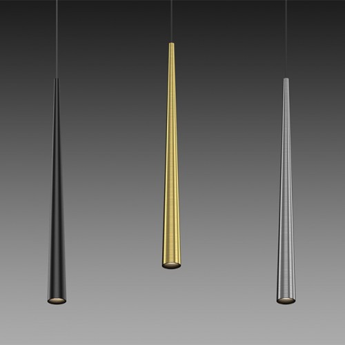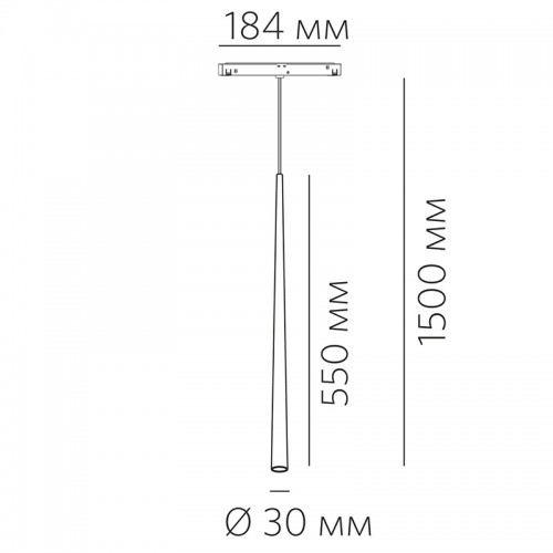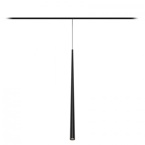 LOGIC RC550 5.30 B — подвесной светильник для магнитной трековой системы Space 48V. Вытянутый конус длиной 550 мм и диаметром 30 мм, чёрное прямоугольное основание, чёрный тросовый подвес и чёрный алюминиевый корпус с порошковой окраской. Всё выдержано в одном цвете — глубоком матовом чёрном. Это максимально сдержанное решение: на чёрном шинопроводе светильник буквально растворяется, оставляя только чёткий световой конус. На светлом треке — работает как строгий графический акцент, вертикальная линия, которая задаёт ритм и подчёркивает геометрию пространства. Длина подвеса регулируется до 1500 мм.